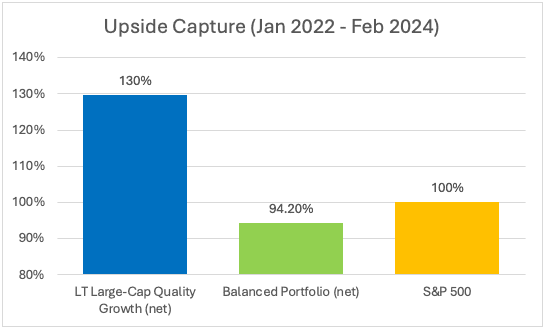 Upside capture is the participation an investor has when the market rises. If the market is up 10%, and you’re up 6%, then your upside capture is 60% of the market. While upside capture is important, it is only one part of success, and in many ways, it is not the most important factor of long-term compounding. When a portfolio rallies, but then declines significantly, the net result may not be positive. Investors seeking long-term wealth can’t use upside capture as their only measurement; down-side capture and down-market recoveries are equally (if not more) important. Below you can see how a balanced portfolio only captured 94.2% of the upside versus 130% for the Linden Thomas Large-Cap Quality Growth , meaning the Large-Cap Quality Growth Index outperformed the balanced portfolio during this rally: