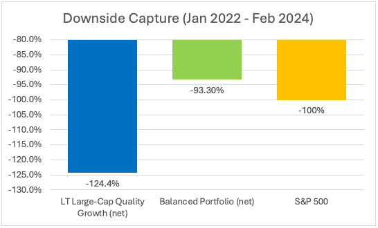 Downside Capture is the opposite of up-capture. It is the amount your portfolio declines when the markets are down. If the market is down -20% and your portfolio is down -10%, your downside capture is 50% or half of the market. Why is this important in building long-term wealth? Because if you’re down -10%, then you need a +20% gain to return to your breakeven value. Unfortunately, investors too often seek results without considering down-market capture. This is why downside capture should always be considered when building a portfolio. Below you can see how the balanced portfolio only captured 93.3% of the downside when compared to the Large-Cap Quality Growth index’s 124.4%:
