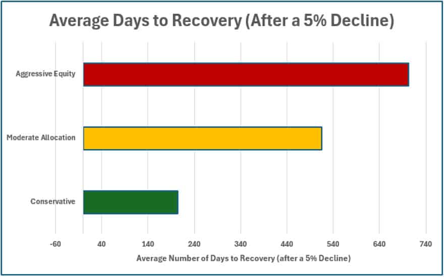 Down-Market Recovery is how long a portfolio takes to return to its pre-pullback value. Wealth and compounding are only achieved when you are building on your original value. Growth isn’t restored until you get back to the starting line. Too often risk and portfolio recovery aren’t considered in a plan for long-term wealth accumulation. Only when a portfolio is restored to its original value does excess compounding restart. Like a NASCAR race, success don’t always come from having the fastest car – it’s also how quickly you get out of the pit and back in the race. When a portfolio goes down, your first goal should be to get back on track by restoring principle:
