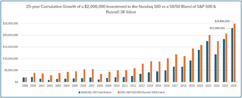 A person earning a steady 6% with 50% less risk in the market, and a high down-market recovery percentage, will often outperform a portfolio that often outperforms but with high risk and poor recovery characteristics. Below is an illustration of a portfolio built on the NASDAQ-100 compared to a portfolio composed of 50% S&P 500 and 50% the Russell 3000 Value: