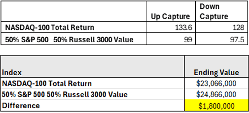As you can see above, the long-term compounding over a full market cycle for the NASDAQ-100 Total Return underperformed the 50/50 portfolio, despite the NASDAQ portfolio having a greater upside capture. The down-market capture and down-market recovery characteristics were more important.