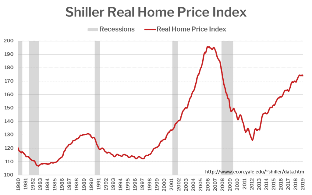 In exhibit 3, the right-most gray bar highlights the rapid collapse of housing prices, after a multi-year run-up. When the market finally bottomed out in 2012, prices had returned to levels last seen in 2000, effectively erasing 12 years of gains.